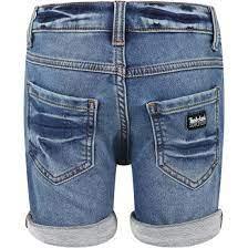 Calções em tecido denim elástico, modelo regular fit com cintura regular. Calções com cinco bolsos com efeito desgastado.