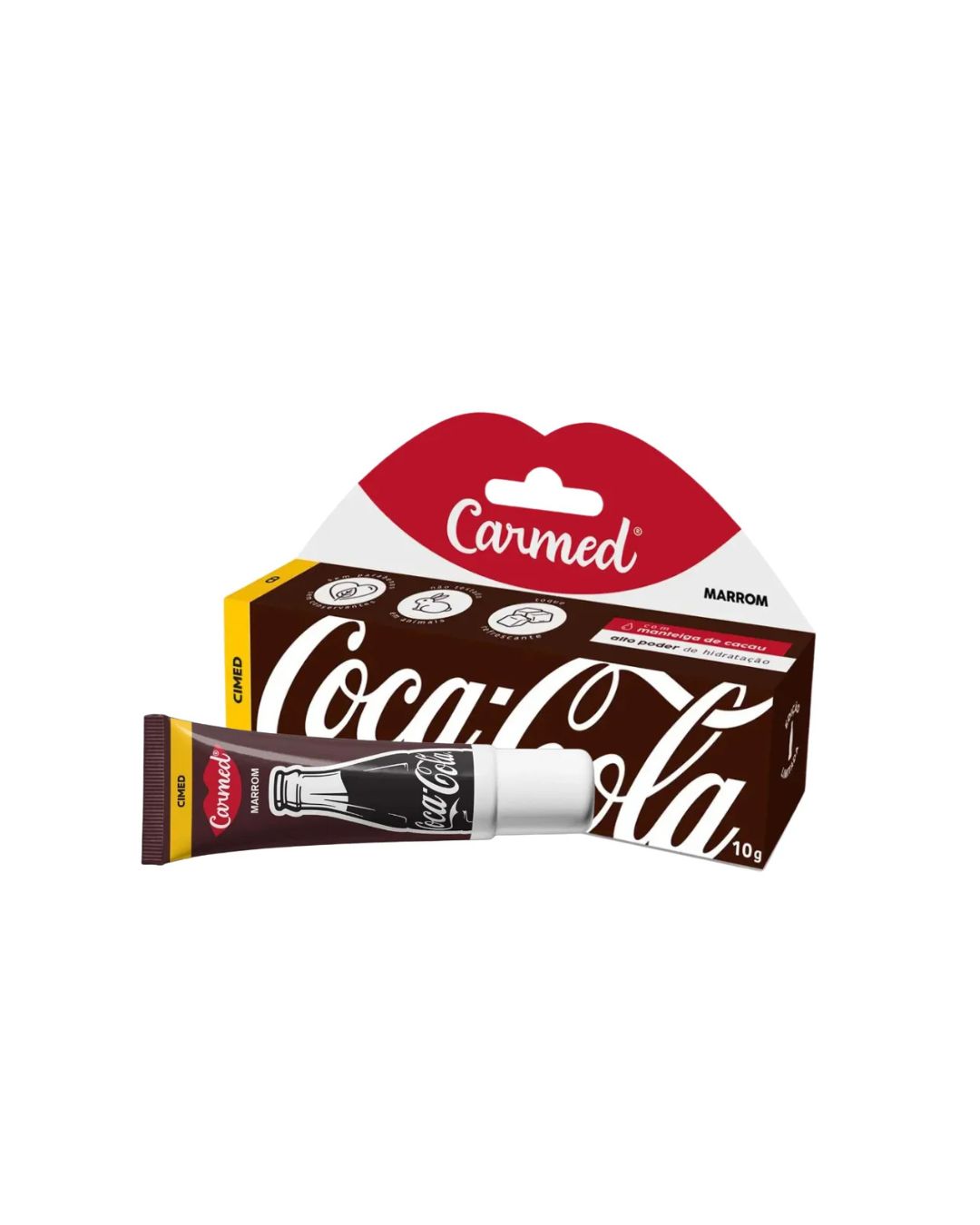 Carmed Coca-Cola Marrom é um hidratante labial que proporciona cuidado diário com um aroma clássico a Coca-Cola, ajudando a manter os lábios hidratados, macios e protegidos contra o ressecamento. Apresenta um brilho subtil, com cor praticamente impercetível, e não possui proteção solar.