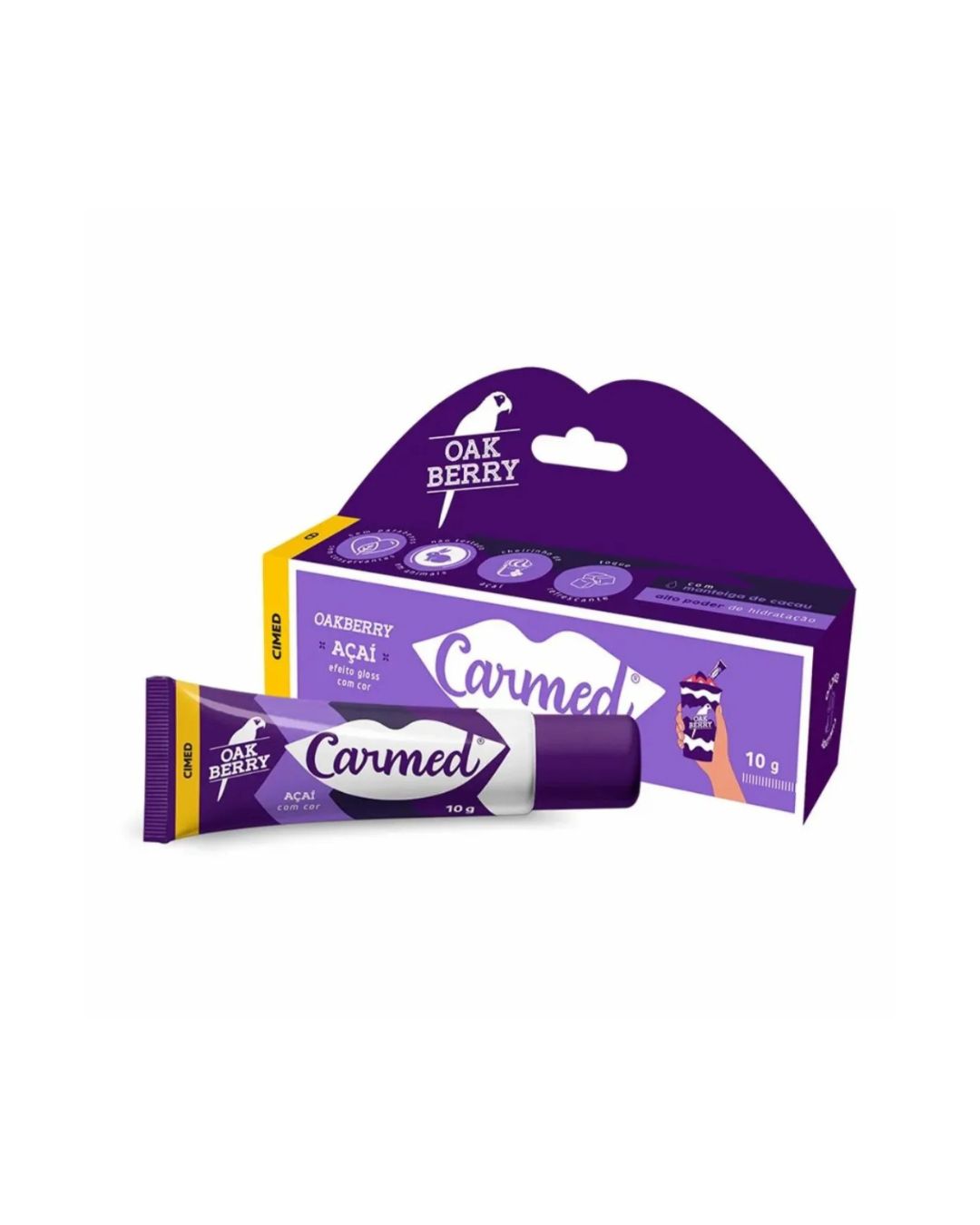 Carmed Oakberry Açaí é um hidratante labial com aroma frutado a açaí, desenvolvido para manter os lábios hidratados e protegidos da secura. Apresenta brilho com uma leve tonalidade arroxeada e não possui proteção solar.