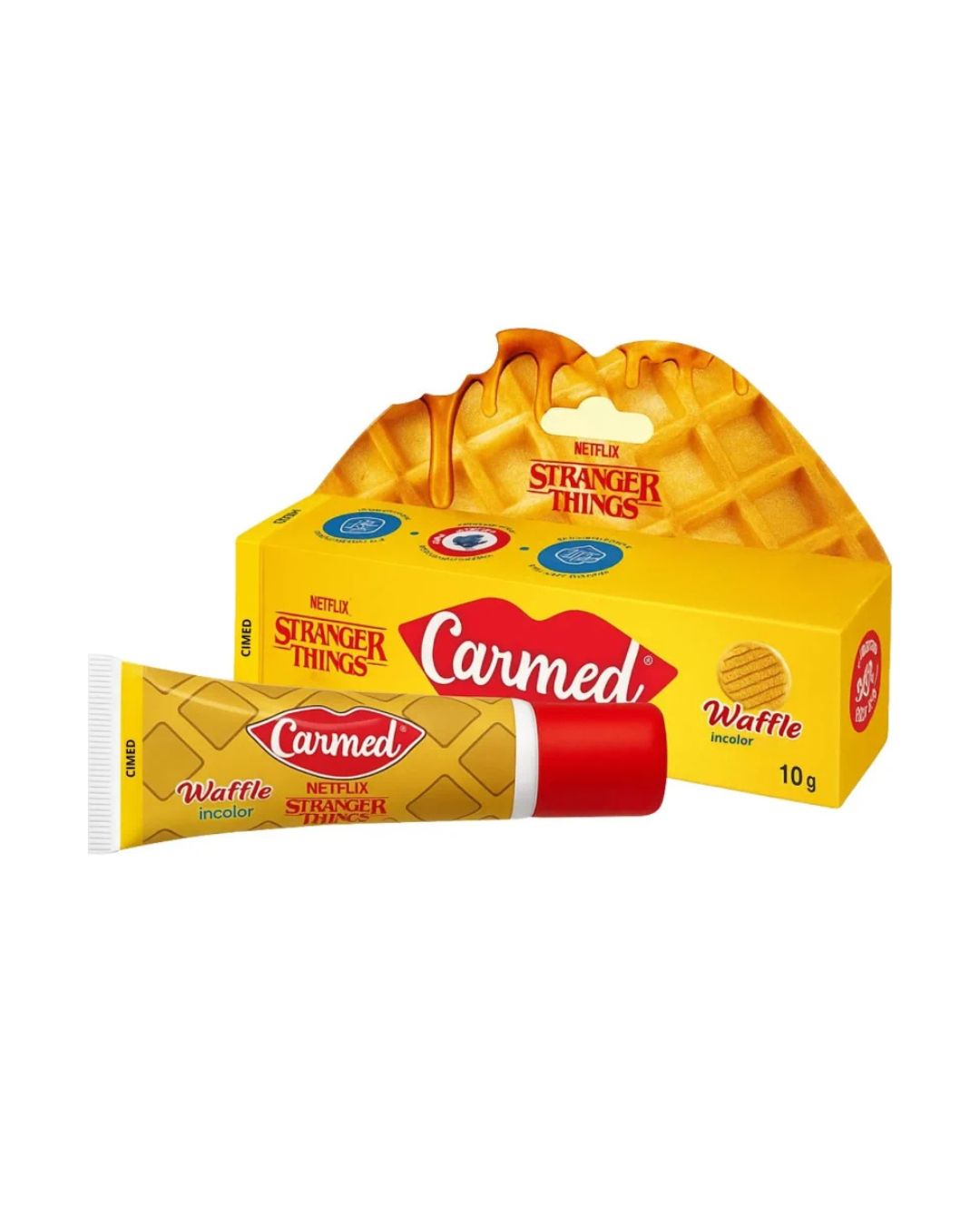 Carmed Waffle Stranger Things é um hidratante labial com aroma doce inspirado em waffle, que proporciona hidratação e conforto aos lábios. É incolor, com brilho, e não possui proteção solar.