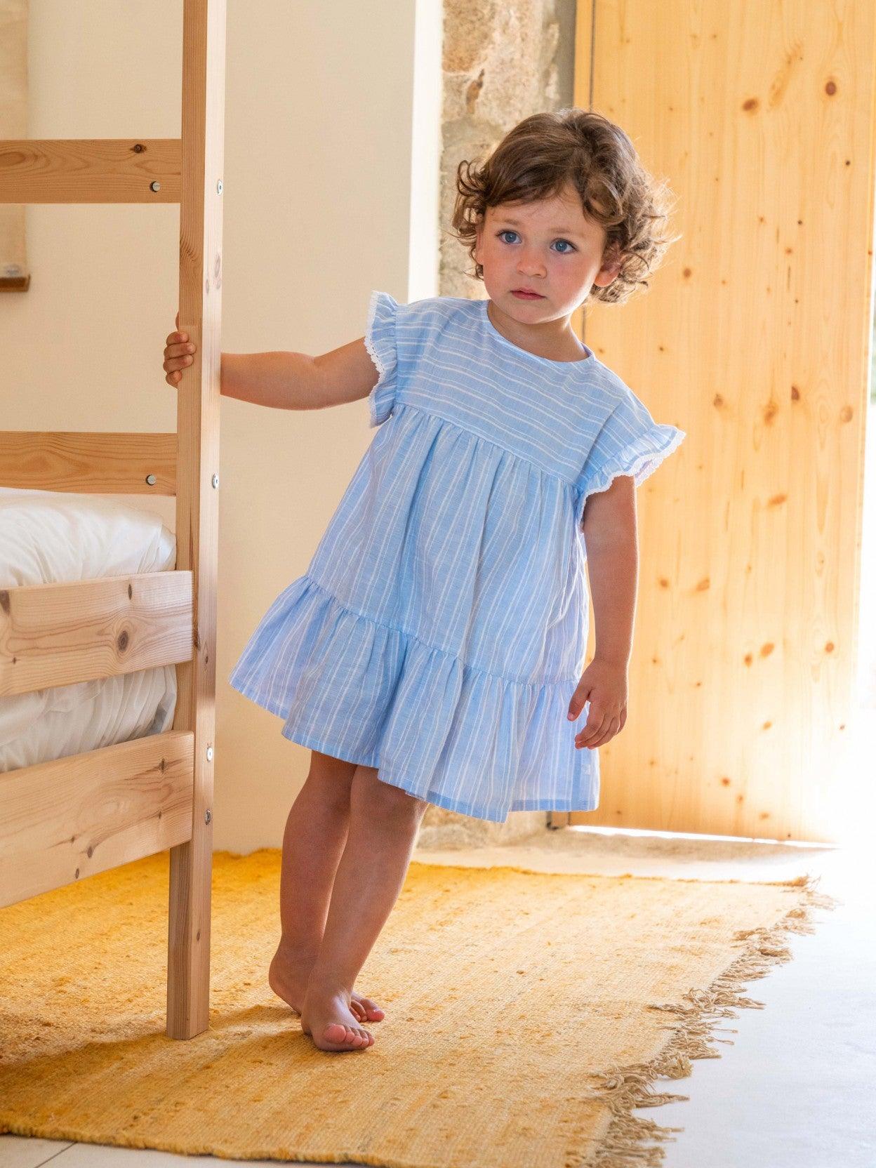 Vestido de linho e algodão orgânico com estampado de riscas. Mangas em folho com aplicação de fita em croché. Aperta nas costas com botões de madeira Laranjinha.