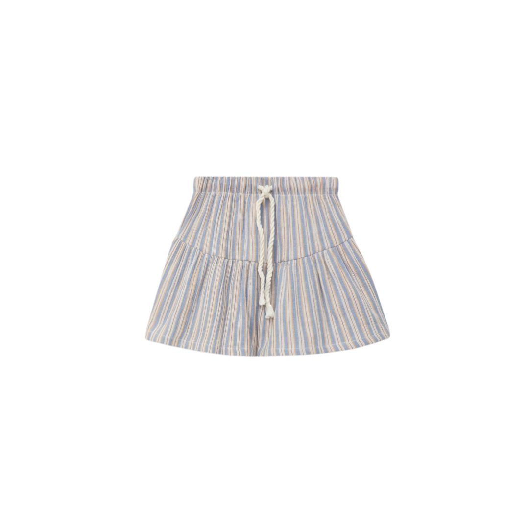 Calções pull-up de riscas, em tons de azul e amarelo. Combina perfeitamente com o top amarelo de costas abertas.