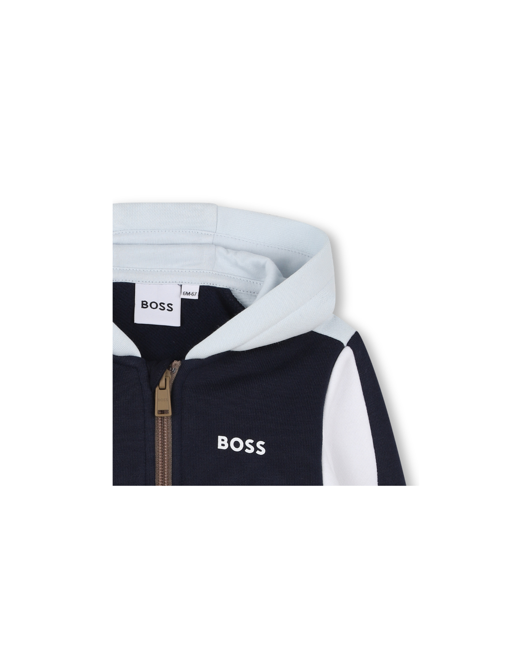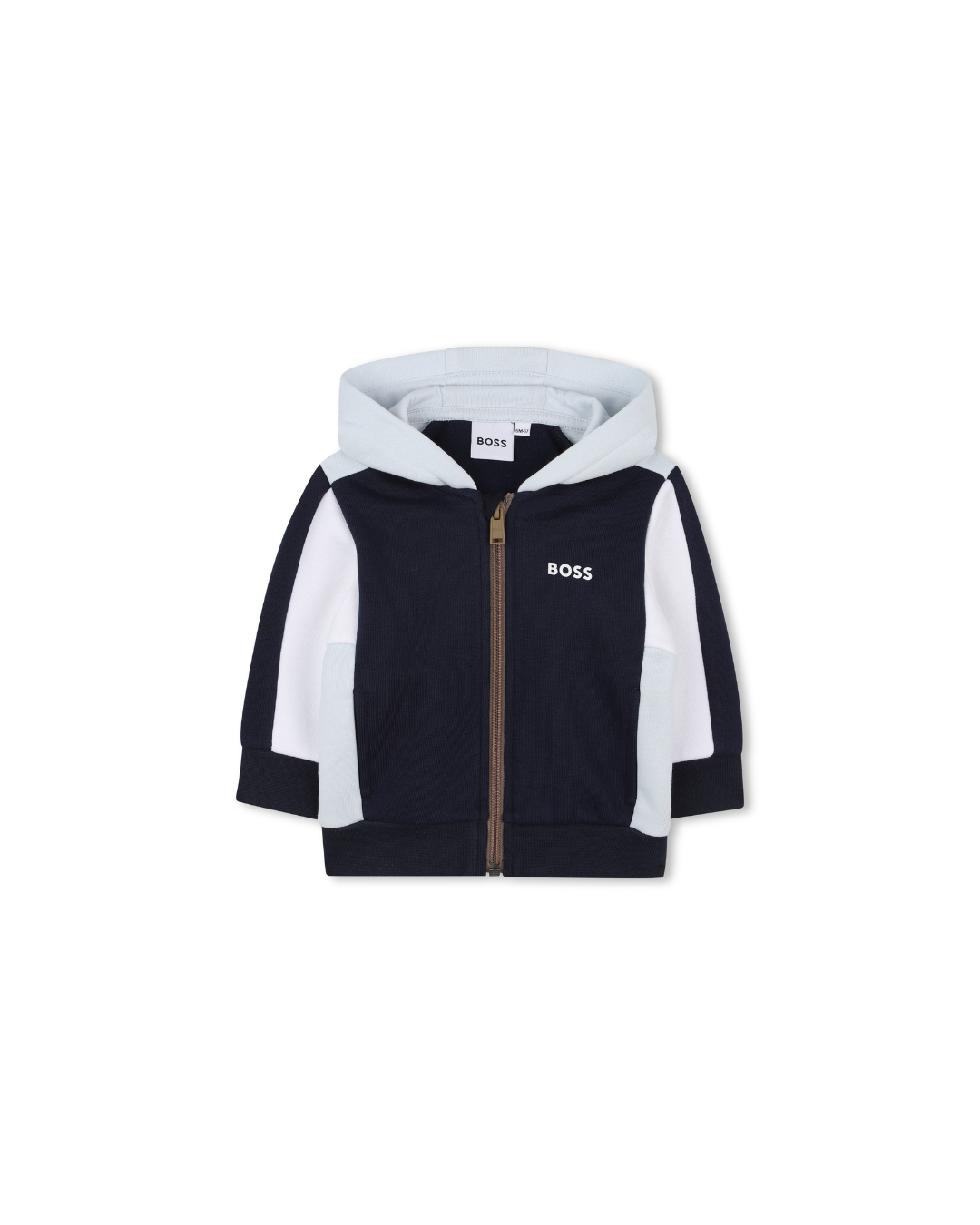 Casaco com capuz BOSS para menino, em blocos de cor nos tons azul-escuro e azul-claro. Com fecho frontal prático e bolsos laterais, é uma peça confortável e funcional para o dia a dia. O logótipo discreto “BOSS” no peito acrescenta um toque moderno e elegante. Perfeito para os mais pequenos, combina facilmente com calças de ganga ou calças desportivas da marca, garantindo um look versátil e cheio de estilo.