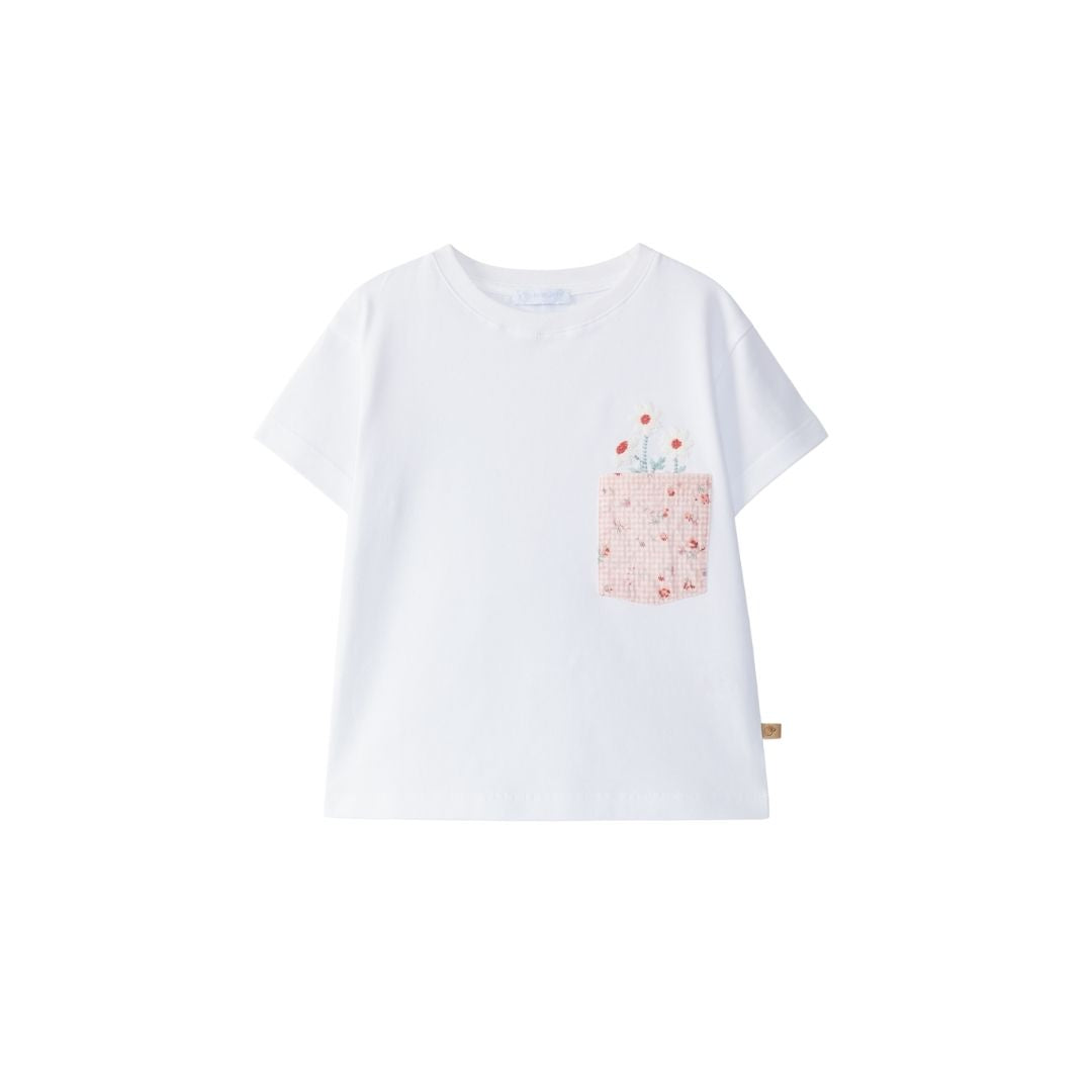 A t-shirt de algodão da Laranjinha é uma peça encantadora com um toque elegante. Com um bolso em padrão floral e feita em algodão macio, proporciona suavidade à pele enquanto adiciona um toque de sofisticação ao guarda-roupa infantil.