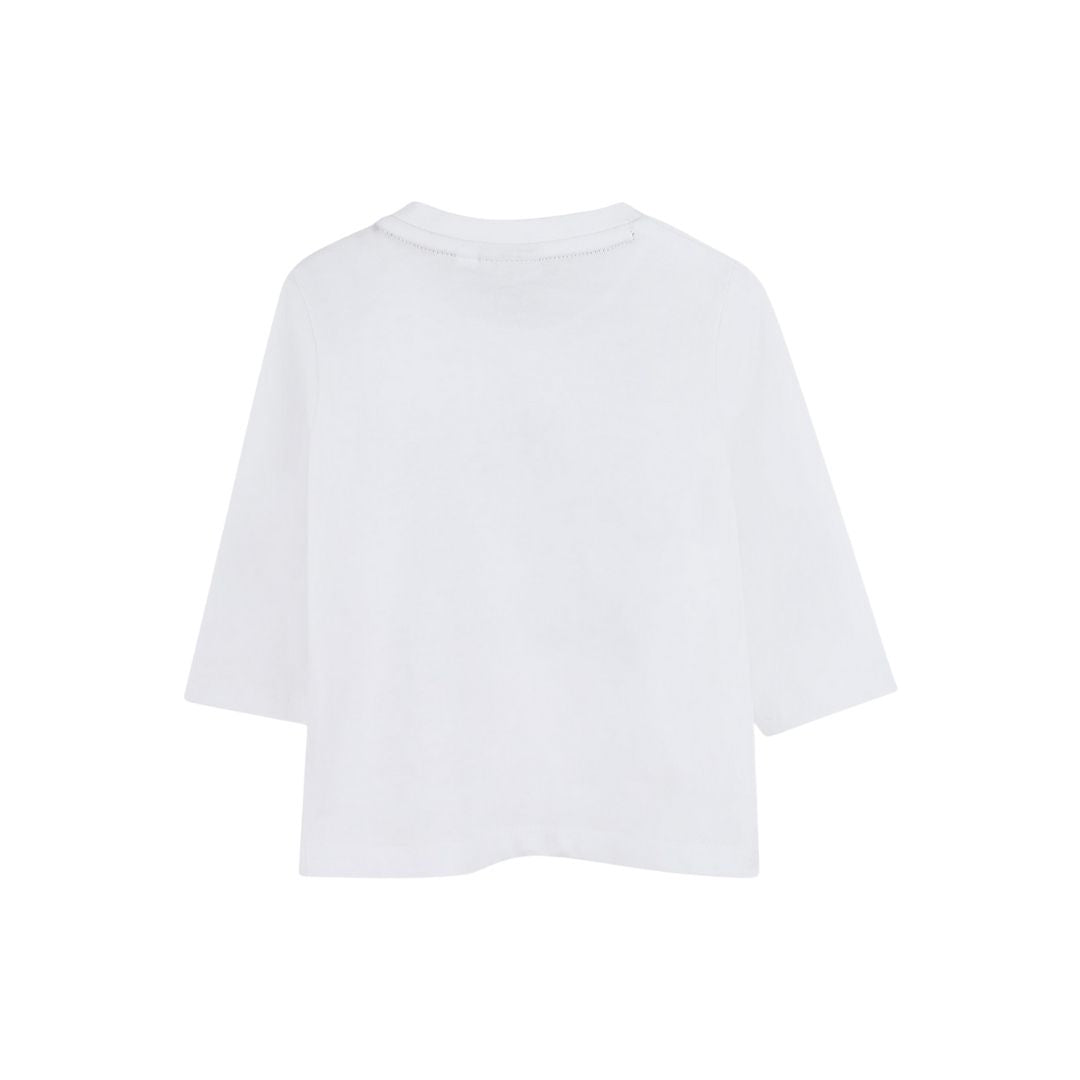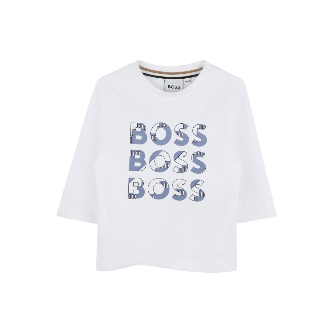 Longsleeve de bebé da BOSS na cor branca, com o logotipo "BOSS" repetido três vezes na parte da frente. Ideal para combinar com um casaco de capuz em tons mais escuros e calças de ganga. Feita de material suave e confortável, perfeita para um look casual e estiloso para o bebé.
