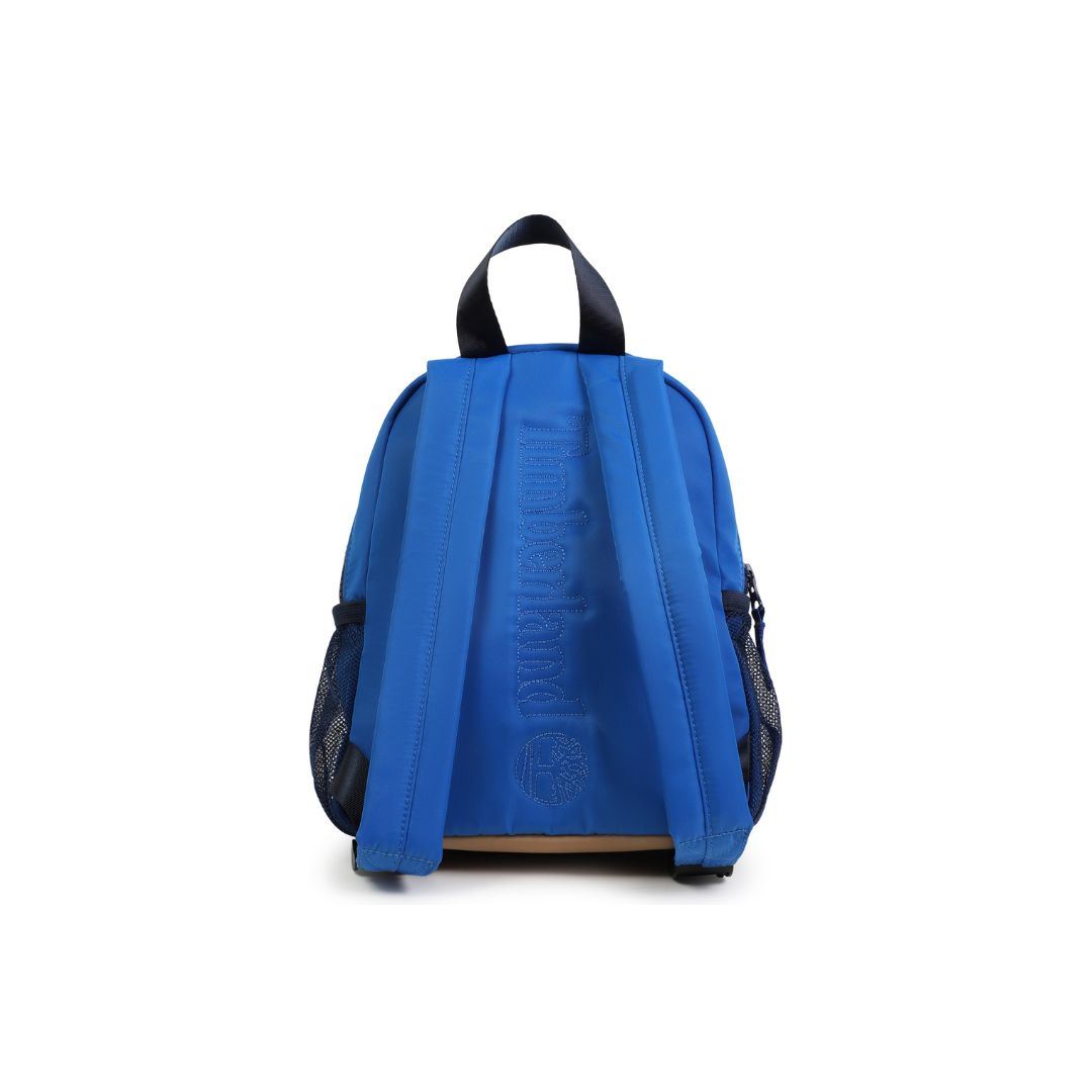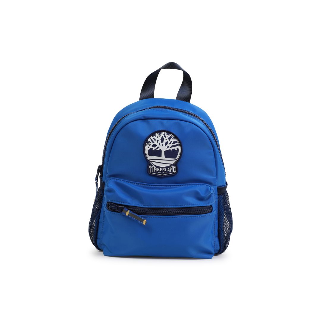 Mochila Timberland na cor azulão, com o símbolo da marca estampado na parte frontal.